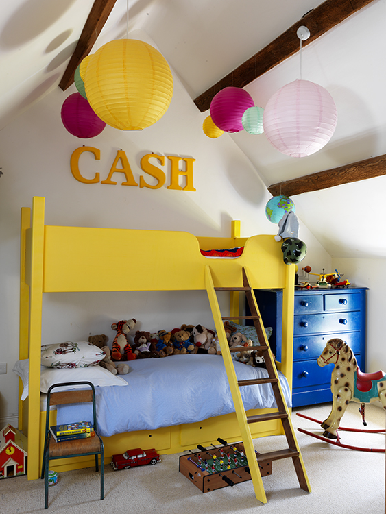 Cash’s bedroom : The bunk bed, made by the boys’ grandfather the artist Roger Burridge, has been painted a brilliant shade of bright yellow (Dulux Sunflower Symphony 4) by Moss. Coloured paper lanterns, bought on eBay for a party, hang from the beams.