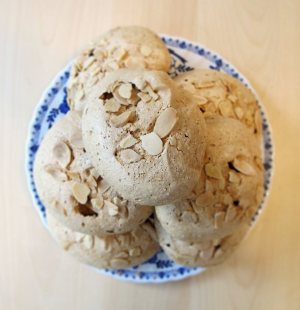 Try mixing in a bit of lemon oil or rosewater (and a teensy-tiny dot of pink food coloring, and sprinkle the tops with flaked almonds or chopped hazelnuts before baking. Bake for an hour at 275 degrees, until the meringues are a dry hollow shell with a chewy base. To serve, knock a hole in the top and fill with a flavored whipped cream, like a traditional Pavlova. I mixed a bit of chestnut puree into mine, but I imagine lemon curd or Nutella would also be absolutely delicious.