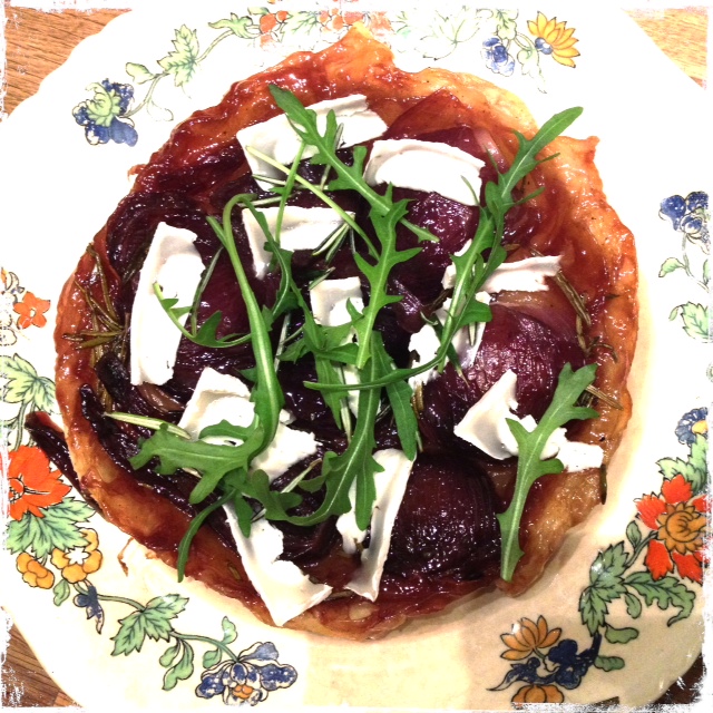 So here it is, the basic recipe is from a book called Notting Hill Cookbook by Carina Cooper which is far from being one of the greatest cook books ever written but this tart makes it almost worth while. Really it’s just an apple tarte tatin but made with onions instead of fruit. There are variations on this recipe all over the internet so you may well find an easier one – I stuck with my original for reasons of sentiment, but also added thinly sliced goats cheese and a little bit of rocket to make it look pretty.