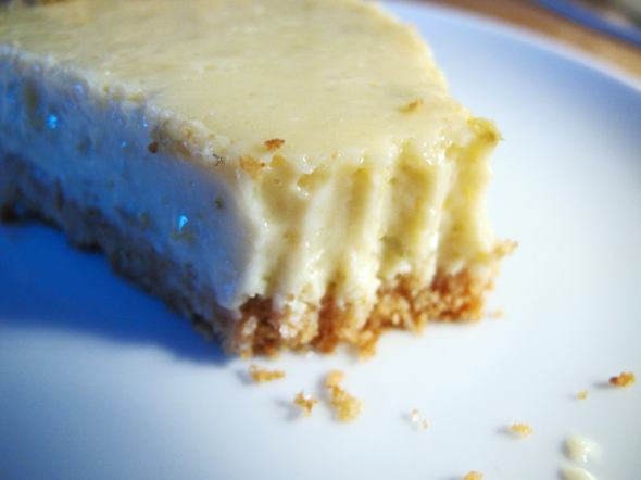 The finished pie will be diminutive in height, and a luxurious creamy color flecked with bits of pale green zest. Cut small slices; this baby’s rich.