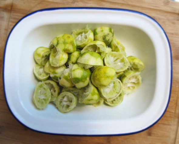 First, you’ll need to zest and squeeze 20 or so key limes. Use a plane zester and an old-fashioned glass squeezer upon which you can palm each half lime. I find myself giving it a quick press and then pinching the spent skin over the glass knob to finish it off. I also take my time, alternating with other chores; try to do them all at once and you’ll bugger up your wrist something chronic.