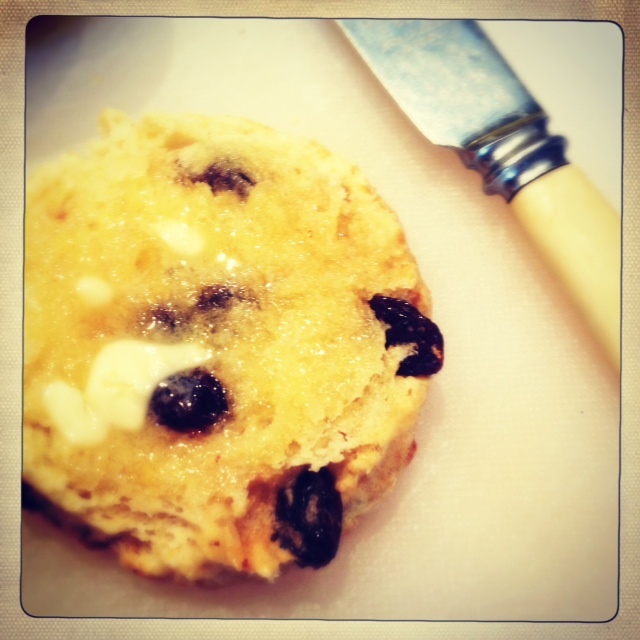 I decided to make scones. Delicious crumbly, raisin filled scones. I’ve always wanted to make them but never dared. I had put the idea in the same “too difficult for me to attempt” box that contains shortbread and hot cross buns, but they’re not difficult at all and made for a very smug Sunday afternoon indeed.