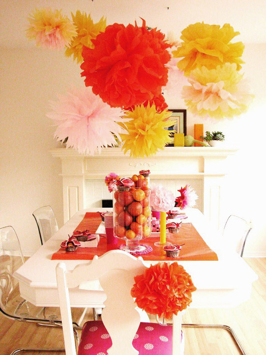 There are plenty of online stores devoted to poms (try Etsy) and many have a wide selection of sizes and colours and you generally choose between rounded or pointed petal ends. The more layers of tissue, the fuller your finished poms. They come folded and ‘unbloomed’ with wire, or ribbon, for hanging. It will probably take you a tad longer than you expect to get the knack (my tip: don’t pull too gently, be confident – fast and random is better) but I can assure you; a fully bloomed and primped pom pom is a very, VERY satisfying thing to behold. Just beware of primp fever. Once you start, it’s really very difficult to stop.