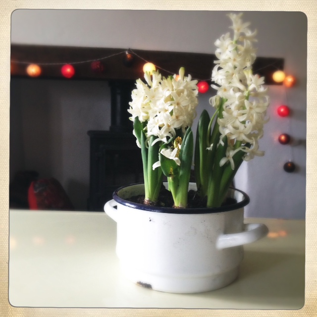 Another thing I discovered this week was that Marks and Spencer are selling potted Hyacinth bulbs for just £2. Re-potted in an old colander, they make a very nice addition to the new enamel table. And they help take my mind off the masses of dust and rubble a small hole in the wall can cause.