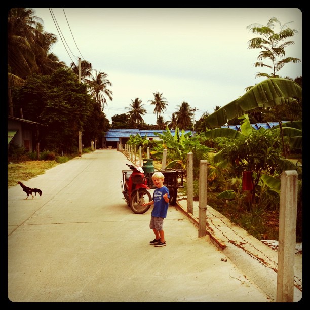 I’d barely left the airport when the first curveball was served- my phone wasn’t picking up a local network. I realised it was locked to my Hong Kong provider and was therefore useless until I could get it unlocked and purchase a local Sim card. To be incommunicado in Thailand with two young children is a little unsettling. The issue was compounded by our location. We’d arrived at night so it was tricky to ascertain exactly where we were in relation to anything but it was clear we weren’t actually near to anything much at all, other than other houses. Daylight confirmed that we were, in fact, situated down a quiet residential lane – in Bang Rak on the North coast- with a couple of other small villa rental developments, and local housing which consists of rustic wooden cottages and modest bungalows amid swaying coconut palms. All very picturesque, but we needed supplies and not a taxi in sight and the couple of housekeeping staff milling around spoke no English and were little help. In fact to find a taxi would actually require a 15 minute walk to the main drag along dusty, pot-hole ridden roads with no pavements, amid throngs of mopeds and 4 wheel drives which appear, seemingly, out of nowhere. Throw in some mangey wildlife consisting of stray cats, dogs and chickens to line the way and you may see why I began to question my decision to brave it alone with a 14 month old in a pushchair and a 4 year old who hates walking.