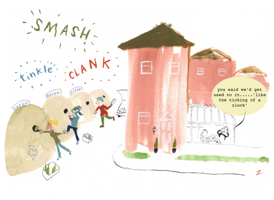 Everyday Things Of Britain – Bottle Bank Neighbours : a cartoon by Zebedee Helm