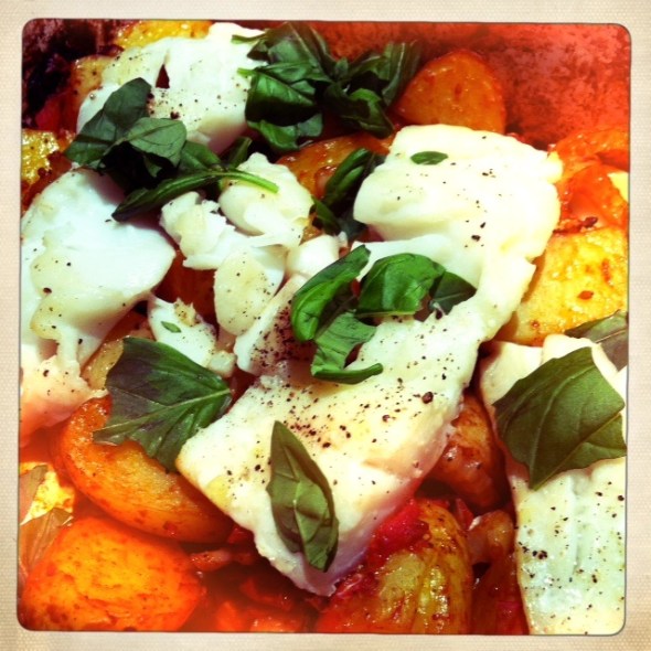 The basic formula remains the same but I used smoked cod, in stead of plain and added fennel and basil to the baby plum tomatoes plus some par-boiled Charlotte potatoes.