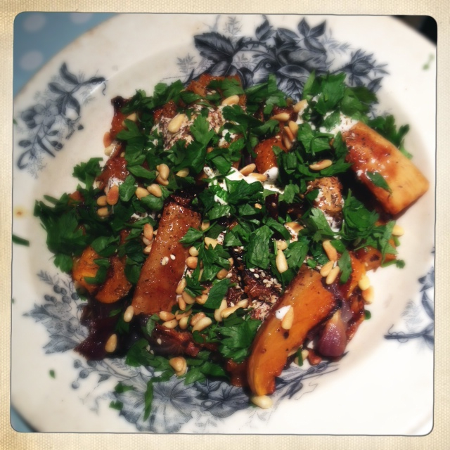 And then last night came the best of the best, both from Jerusalem : Pureed Beetroot with Yoghurt and Za’atar and Butternut Squash and Red Onion roasted with Tahini and Za’atar. It was ridiculously good and so easy and really annoying that we had no one over for dinner to show off to share with.