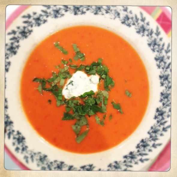 We started with The Moro Cookbook and both Ottolenghi’s, Plenty and The Cookbook and most recently we’ve moved on to the wonderful new Jerusalem from Yotam Ottolenghi and Sami Tamimi. We’ve re-stocked our spice cupboard with things such as Zatar and Sumac and made sure there’s enough Cumin, Turmeric, Corriander and Cardamon to see us through every recipe we may attempt. To begin the feast I chose something relatively easy : Chilled Red Pepper Soup and Cauliflower Fritters, both from Ottolenghi followed by Aubergine and Tomato Pilav from Moro. Not all in one sitting, that would be ridiculous….although very very tempting.