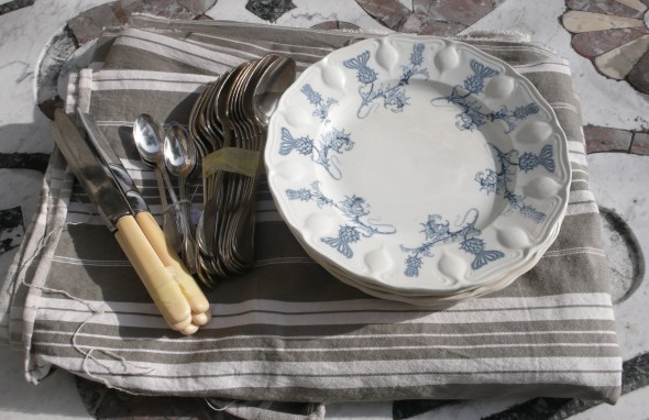 My finds were as follows : a 6 piece set of matching plates, a bundle of fabulous french stripe fabric and some silver and bone handled cutlery – 6 of each utensil and all in pristine condition.