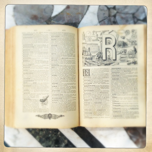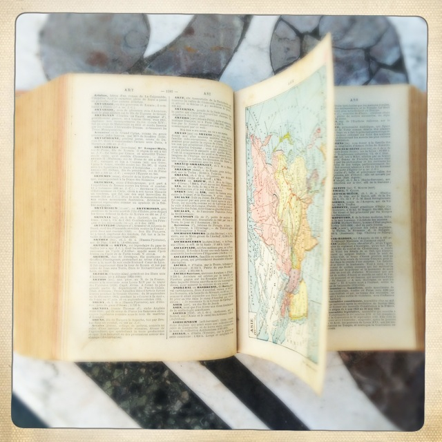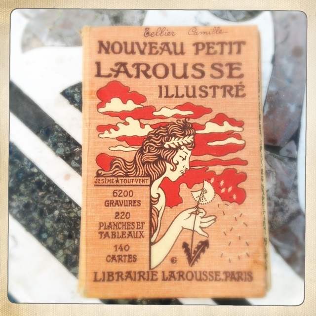 My find of the day was a Petit Larousse Illustre from 1934 for which I paid just 1 Euro. It is a beautiful edition, far better than the one I had at school and I have no doubt this will have me speaking fluent French, as well as knowing all kinds of out of date facts, in no time at all. Every single page is illustrated, be it a thumbnail explanatory sketch or a full colour plate map. It is most certainly treasure and one day, when their fingers aren’t covered in something dirty or sticky, I’ll let the boys use it too. For now it will stay safely on a book shelf, cover side out.